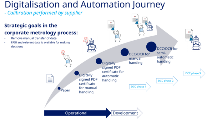 Novo Nordisk, established in 1923 and headquartered in Denmark, is a global healthcare company dedicated to providing medication for chronic diseases. Our operations are managed through process management across the organizational structure, with the corporate metrology process ensuring reliable and traceable measurements for critical processes. This paper focuses on two strategic goals within our corporate metrology process: eliminating manual data transfer and ensuring that data is Findable, Accessible, Interoperable, and Reusable (FAIR) as well as relevant, thereby facilitating informed decision-making. To achieve these objectives, we are conducting pilots to implement Digital Calibration Certificates (DCC) and Digital Calibration Requests (DCR).