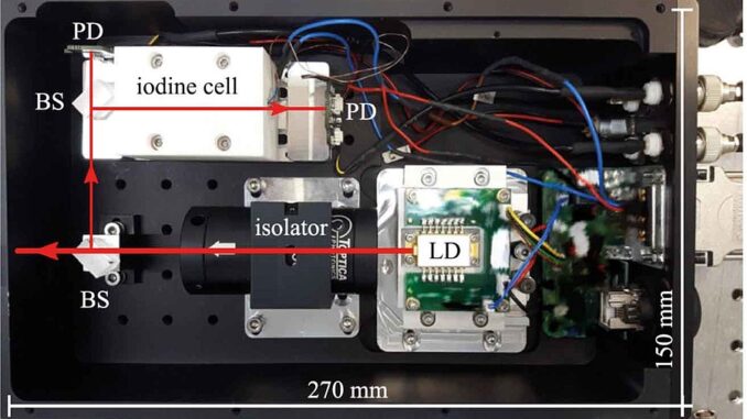 PTBnews 03.2021 — In collaboration with an industrial partner, PTB has developed and assessed a very compact wavelength standard. This standard is based on a diode laser whose frequency is stabilized to transitions of the iodine molecule. In the future, this type of laser could replace power-intensive and bulky helium-neon lasers as a wavelength standard for interferometric length measurement.