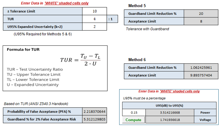 The fourth new feature for 17025 Lookup deals with popular guardbanding techniques. These included Method 5 & 6 from ANSI/NCSL Z540.3-2006, TUR and RSS methods. Conversion from logarithmic percentage to linear percentage is provided when dealing with dB, dBV, etc. (see Fig 4 snippet).