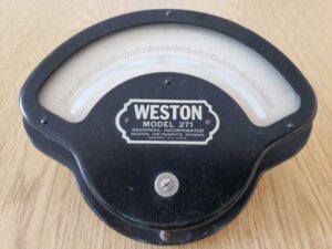 This is a Weston Model 271. Many thousands of these meters were modified and ranged to measure a host of different parameters. Notice that the example shown has a blank scale. A meter like this would enter a value-added production process where it would be outfitted with a custom scale that would often include the logo and other artwork provided by the customer. The meter would also have an internal circuit added to interface with the equipment that it was intended to be used in. This may include series or parallel resistor networks, rectifiers or other components, to meet the requirements of each application. Meters like this could also be modified to indicate in reverse by suppressing the mechanical zero-correctors or have its hairsprings changed out so that the customer could have positive and negative meter indications with a zero-centered scale.