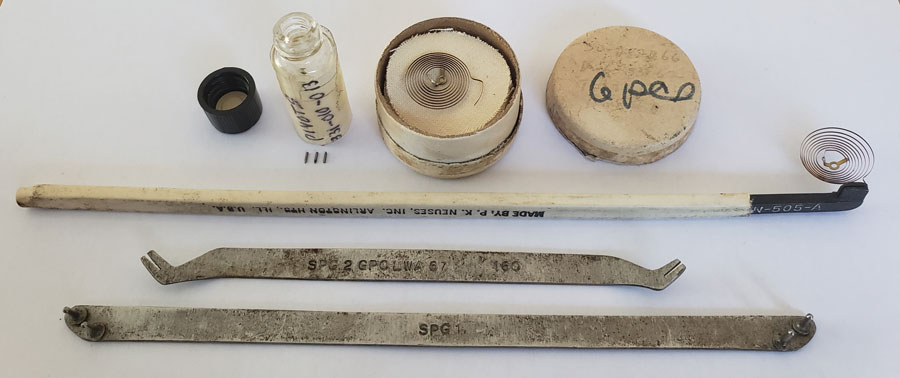 This picture by itself shows many things. Pivots and hair springs. Spring adjuster tools made by P.K. Nueses Inc. These particular tools were made very early on in that company’s history, as Arlington Height Illinois was the location of their original factory. These tools were used to shape hair springs.