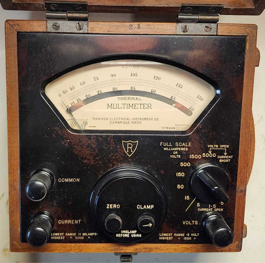 The Rawson Electrical Instrument Company made a variety of other types of measuring instruments including “thermal” and conventional multimeters. One problem that early instrument design engineers had to contend with was equilibrating an AC voltage with a corresponding DC voltage value. In those days, thermal transfer or reference standards were used for this purpose. Basically, a thermocouple was used to sense the value of an AC or DC voltage signal. The resultant meter deflection was plotted on a hand drawn scale. As a thermocouple is an inherently non-linear device, the resultant readings would also appear on a non-linear scale.